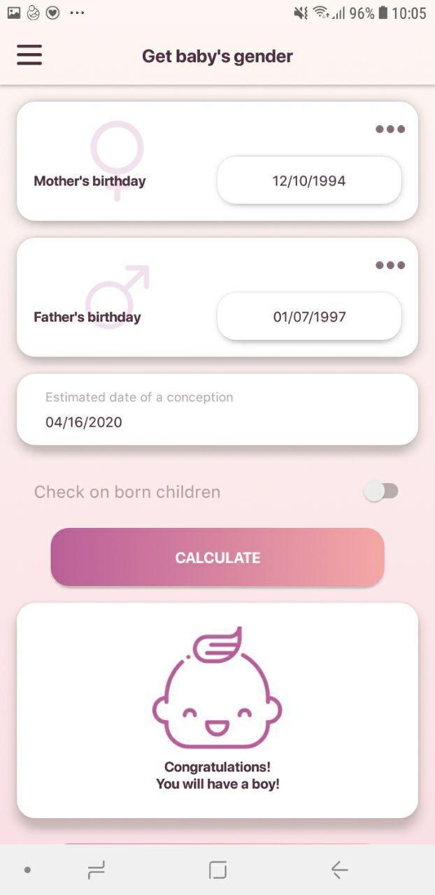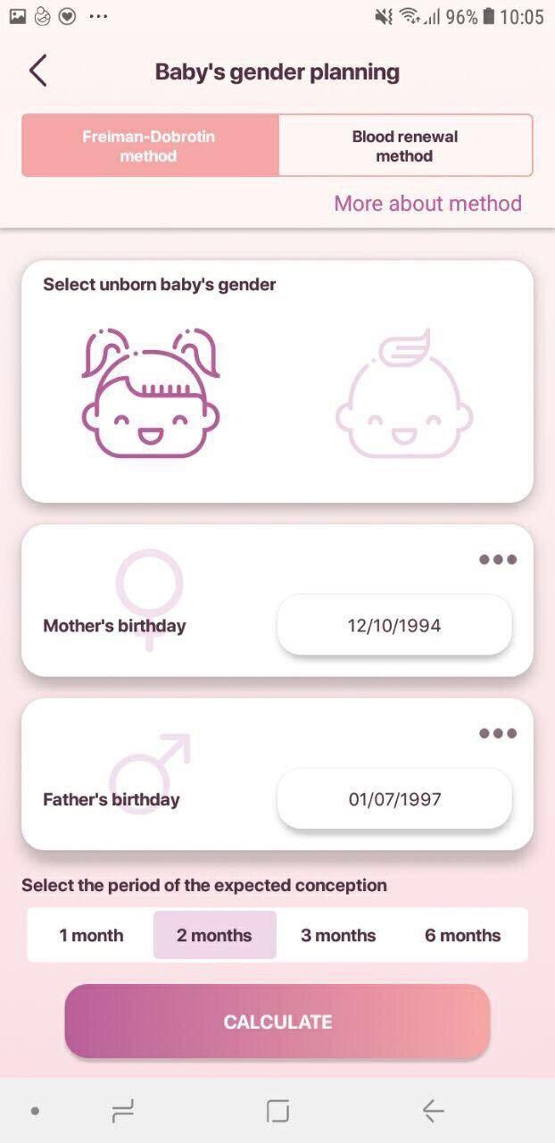 Calculate your future baby's gender by parents birthdays! There are Blood Renewal and Freiman - Dobrotin methods for calculating. Along the calculation results you get useful information for the successful conception of a desirable baby's gender.