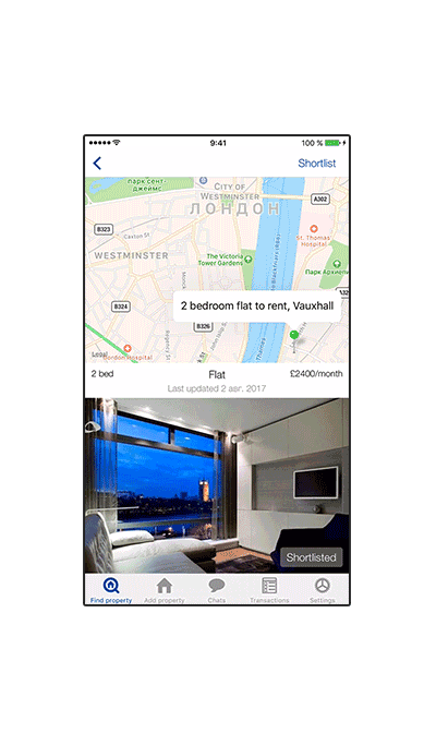 Описание На этом экране отображаются все найденные результаты. Подробности доступны при прокрутке вниз. Прокрутка влево/вправо между вариантами жилья. Шорт-лист необходим для просмотра результата или для связи с владельцем.