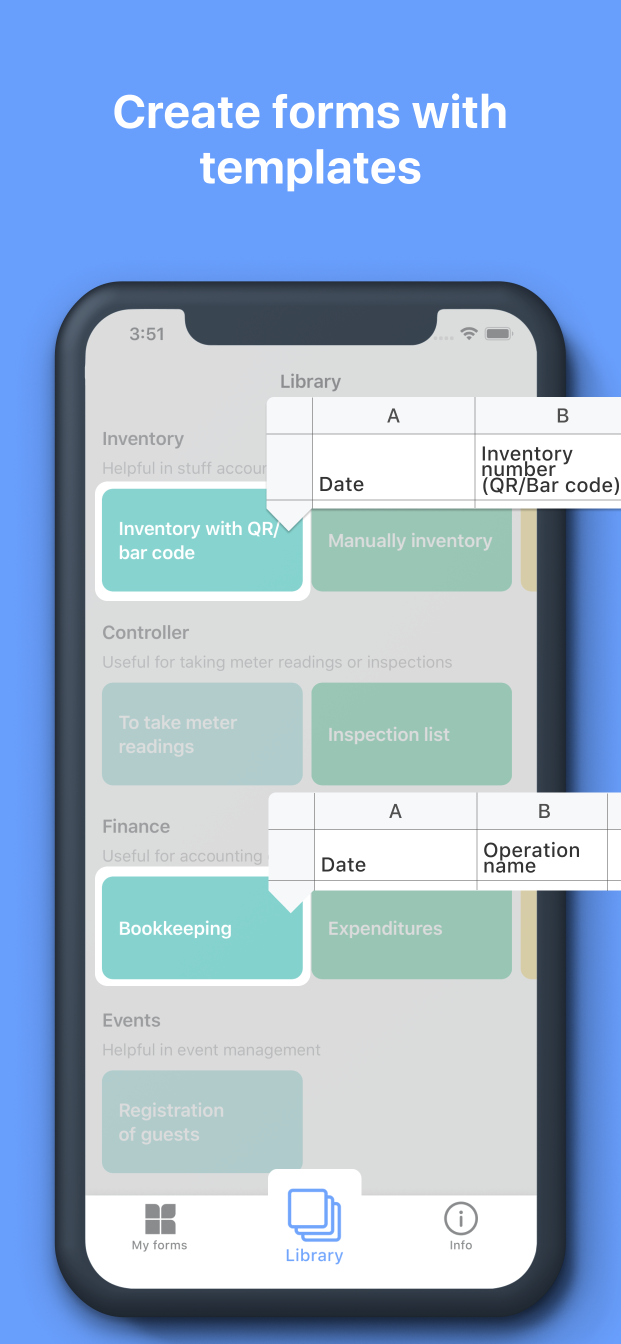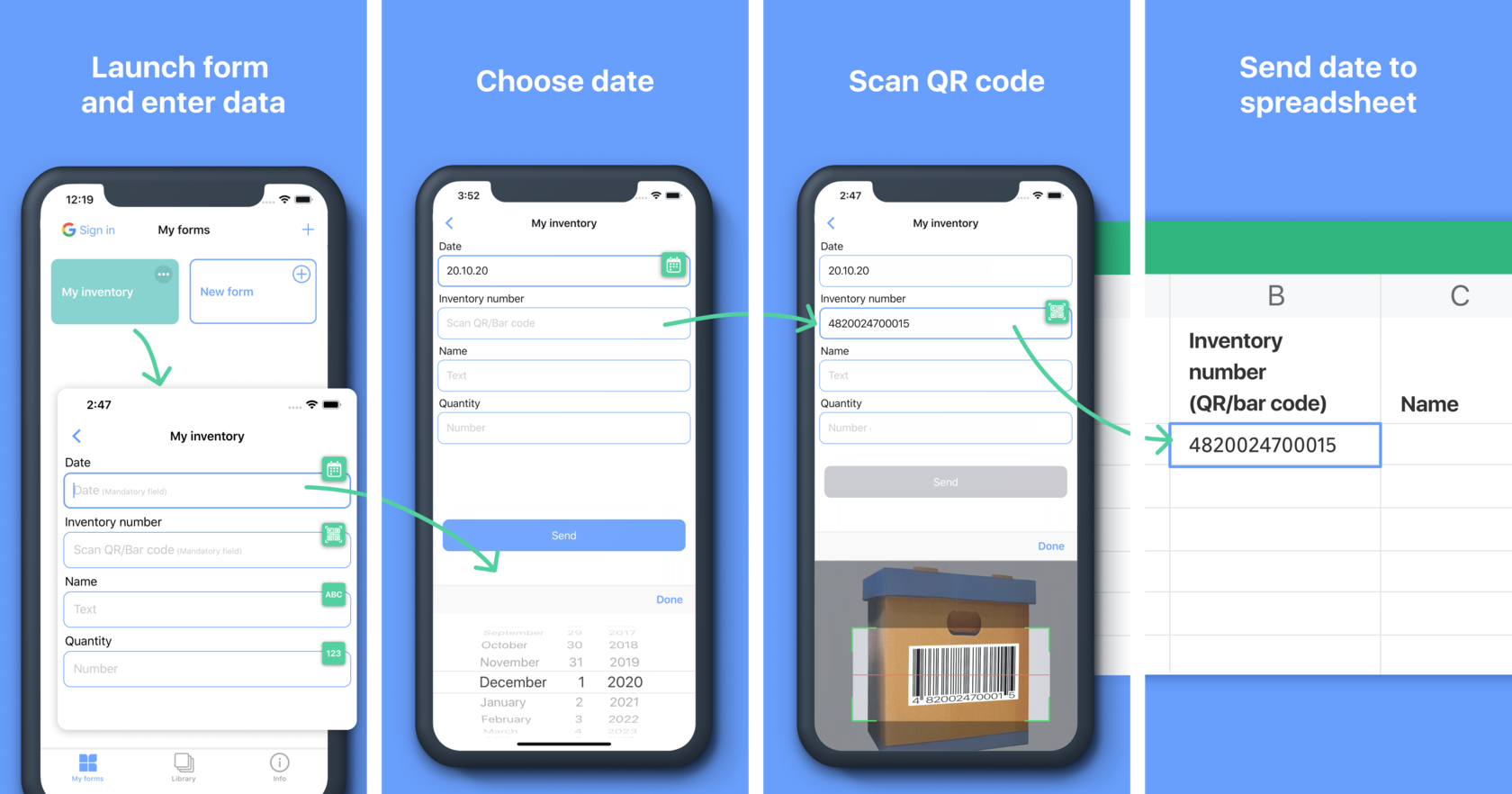 Open library, select template "Inventory with QR/bar code" and tap "Add to my forms"